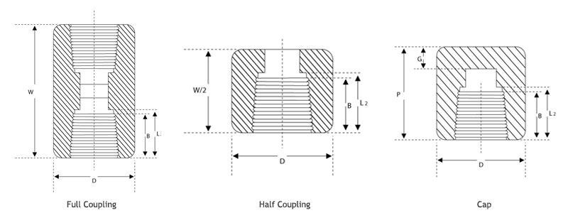 | DIMENSIONS OF THREADED FITTINGS (ANSI B 16.11) (in mm) | ||||||||||||||